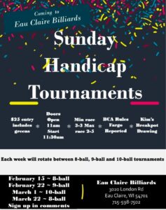 Sundays, 8-ball Singles, One Shot Bar & Grill, Owen