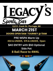 3/21 Singles 8-ball, Max 450, 575 and Open, legacy’s, portage