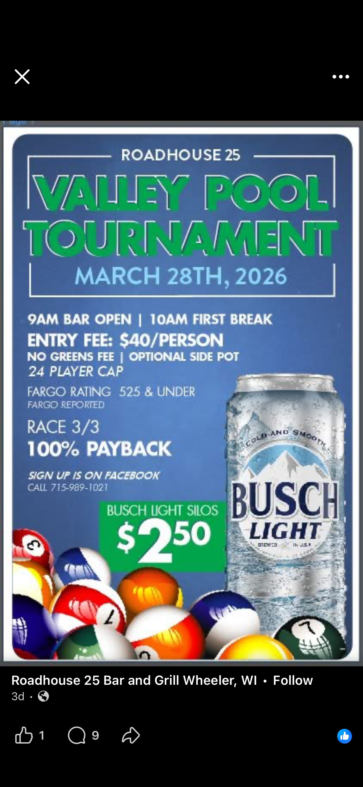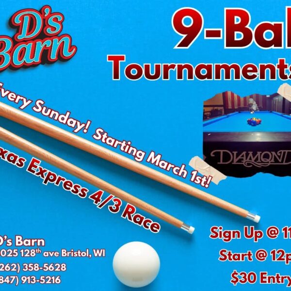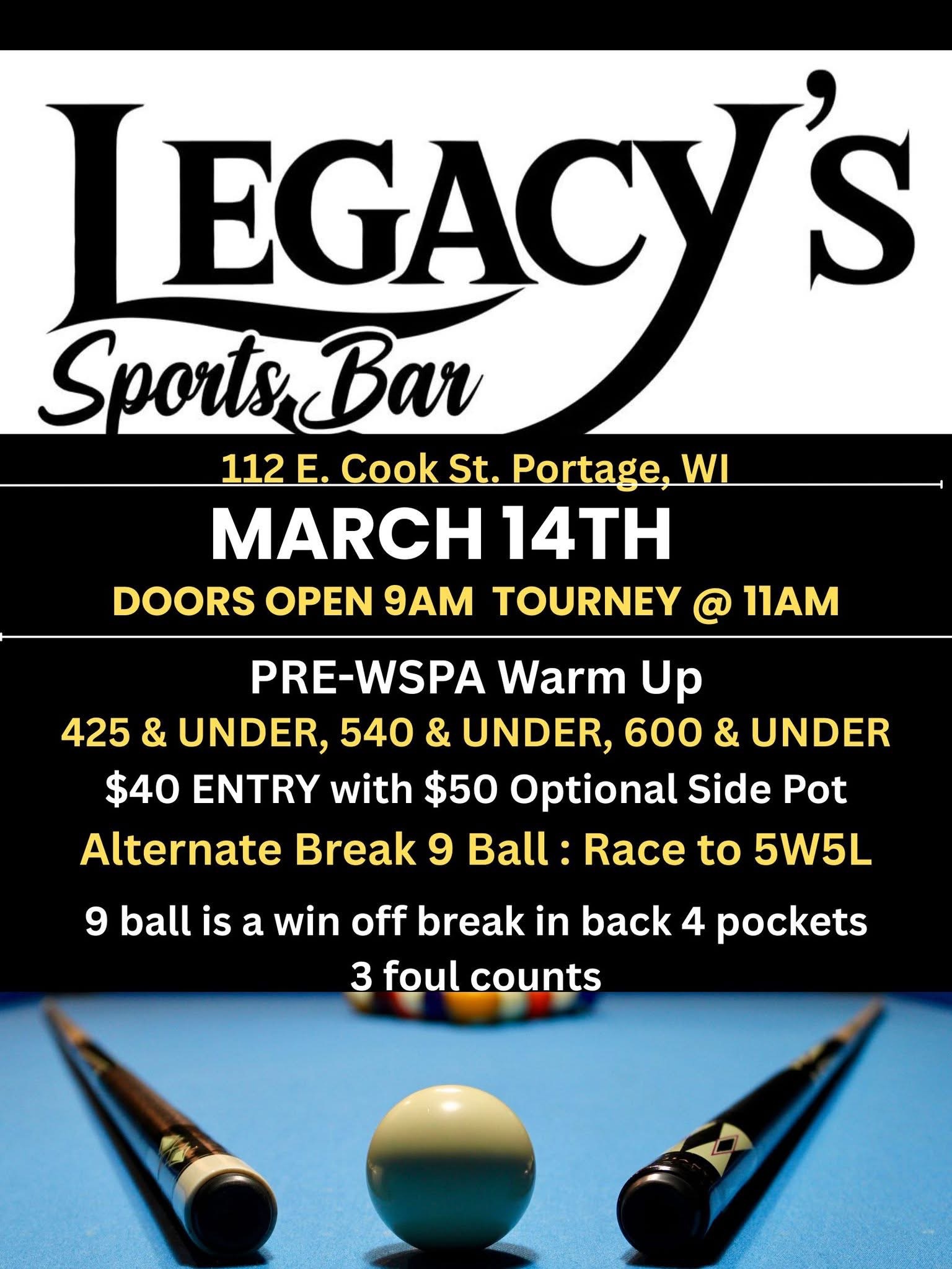 3/14 Singles 9-ball, Max 425, 540 and 600, legacy’s, portage