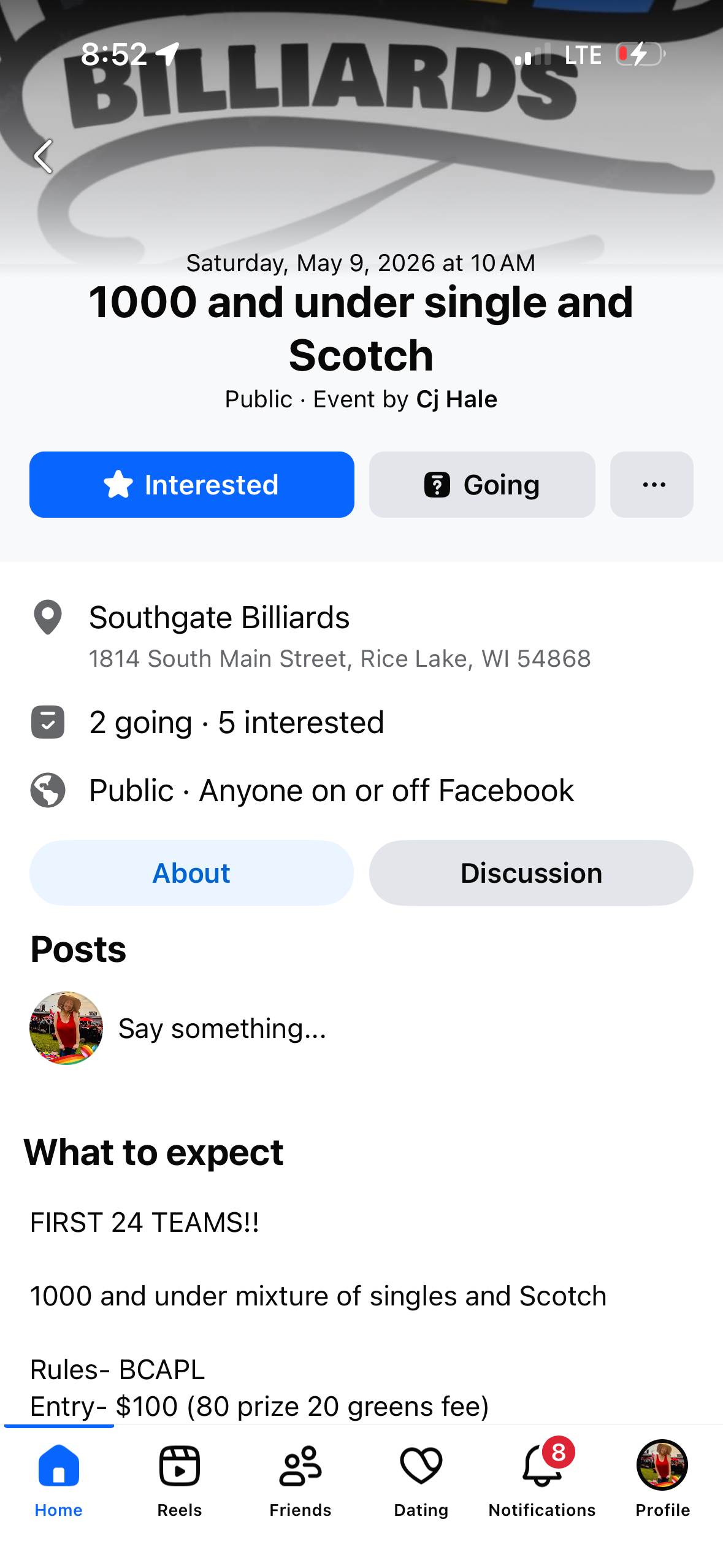 5/9 Scotch Dbls 8-ball, Max 1000, Rice Lake