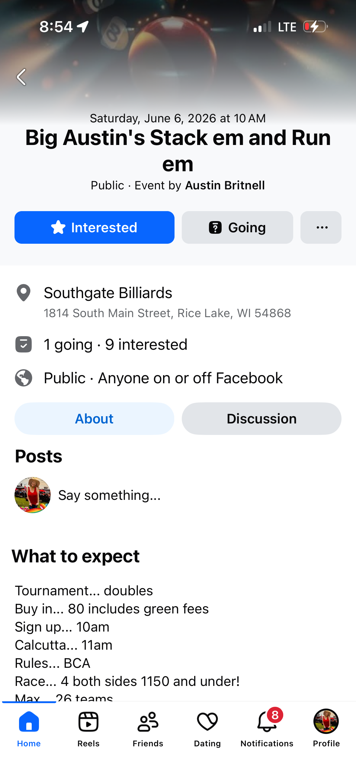 6/6 Doubles 8-ball, Max 1150, Southgate Billiards, Rice Lake