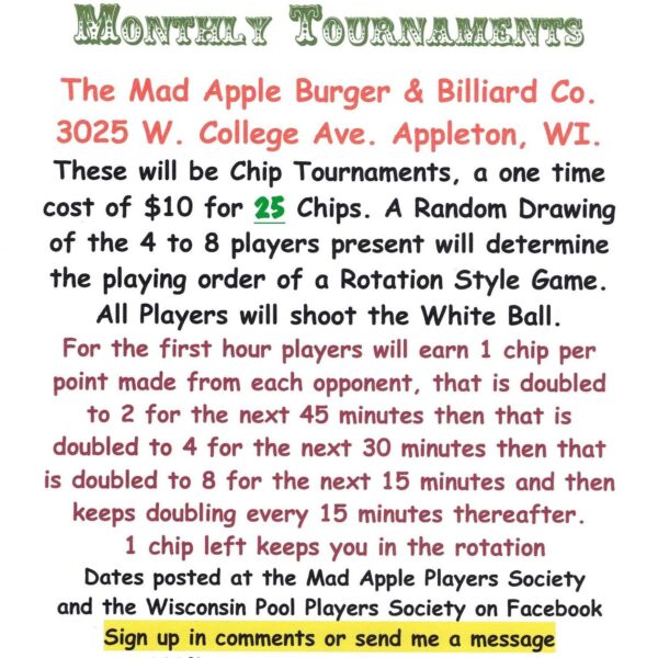 Monthly 3-Cushion Billiards, Mad Apple, Appleton