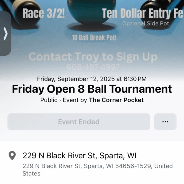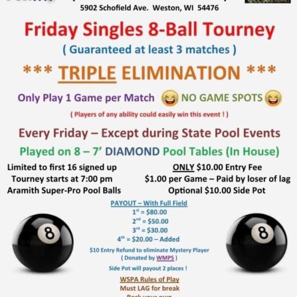 Fridays, Open 8-ball Singles, the Corner Pocket, Sparta