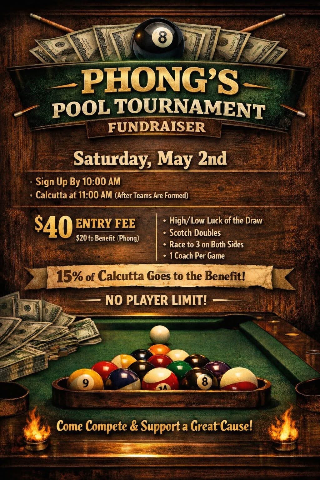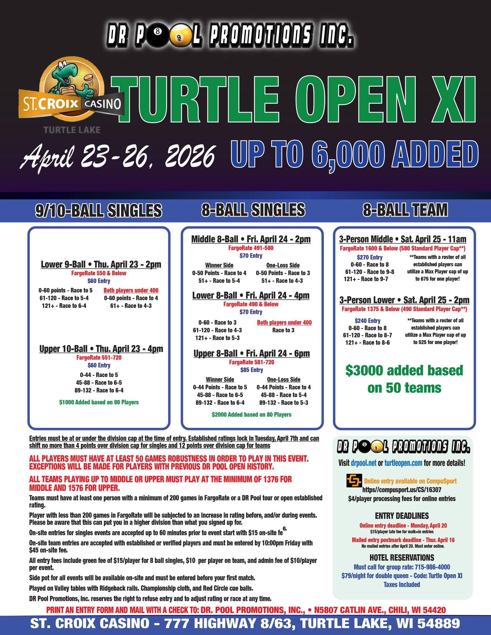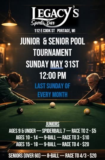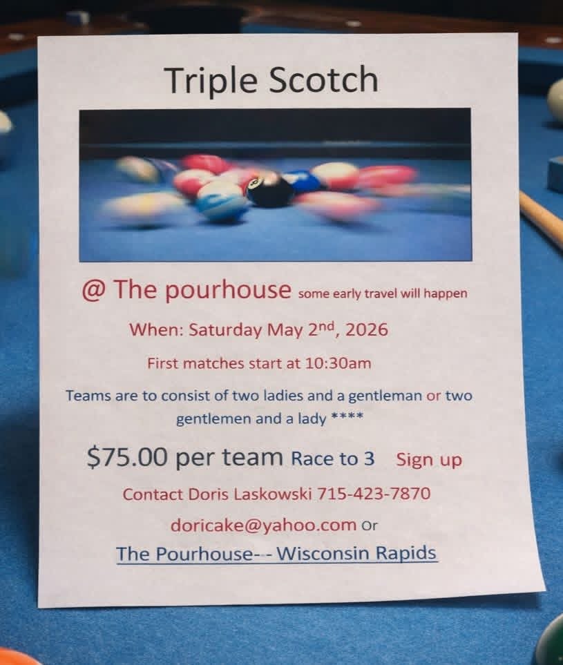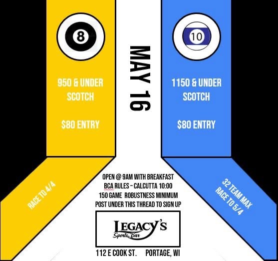 5/16 Scotch Doubles 8-ball Max 950, 10-ball Max 1150, Legacy’s, Portage