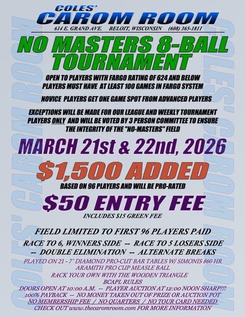 3/21-22 Singles 8-ball, Max 624, Carom Room, Beloit