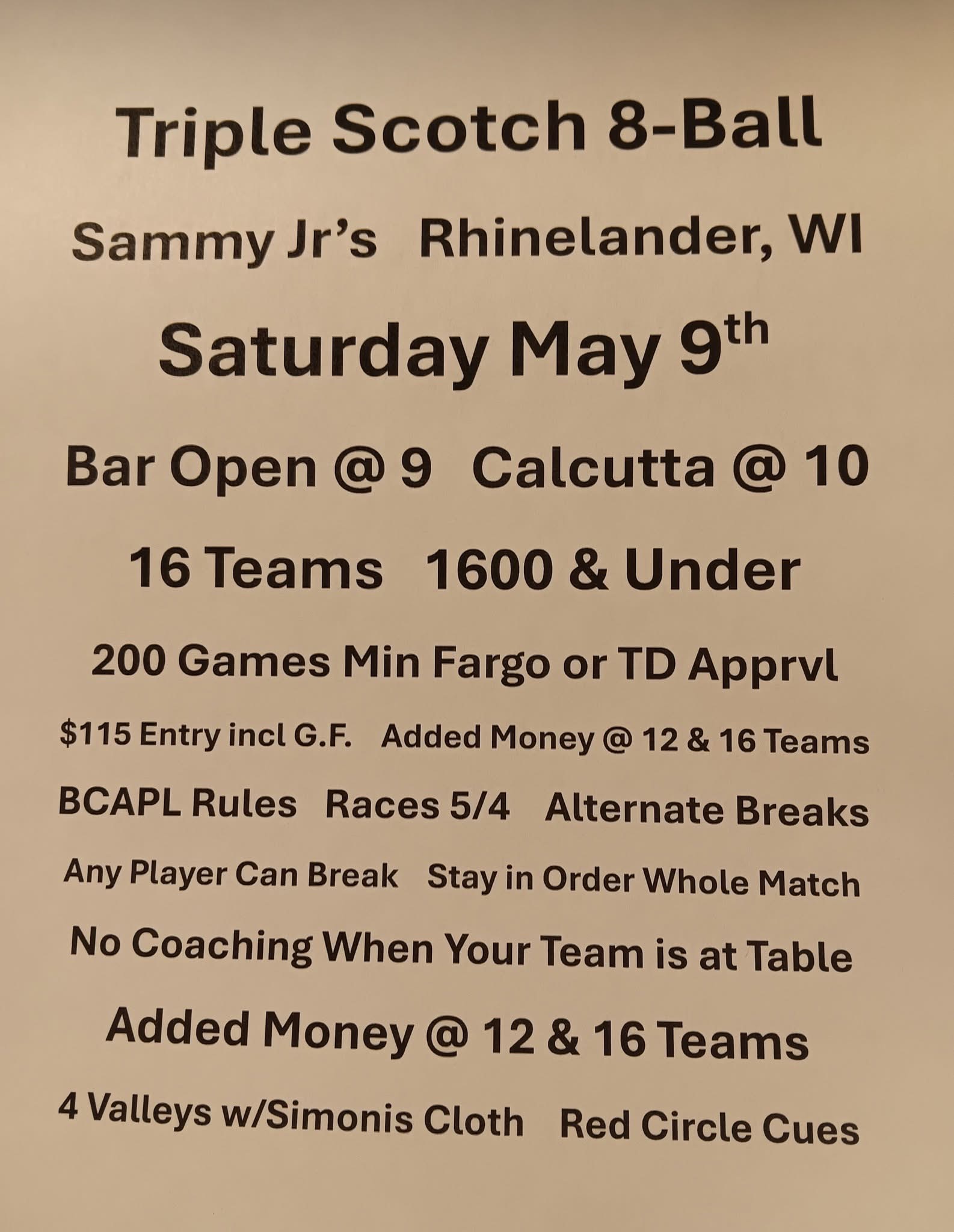 5/9 Triple Scotch 8-ball, Max 1600, Sammy JRs, Rhinelander